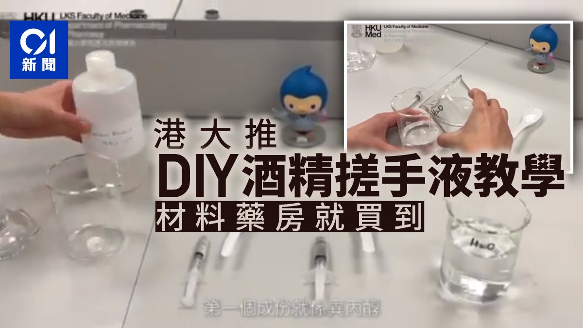 港大藥理及藥劑學系助理教授胡偉康在短片中介紹兩種方法自製酒精搓手液,配合藥房可買到的針筒或外賣膠羹製作,產品完成後需等待72小時便可以使用,以確保製作期間或樽內微生物被消滅。配方一需要用到80毫升96%乙醇、1.45毫升甘油、4毫升外用3%雙氧水及蒸餾水,酒精搓手液合共100毫升,攪拌至沒有一層甘油,最後倒入一個乾淨膠樽。加入甘油是要令到消毒成份留在手上的時間更久,以保持消毒效果。
